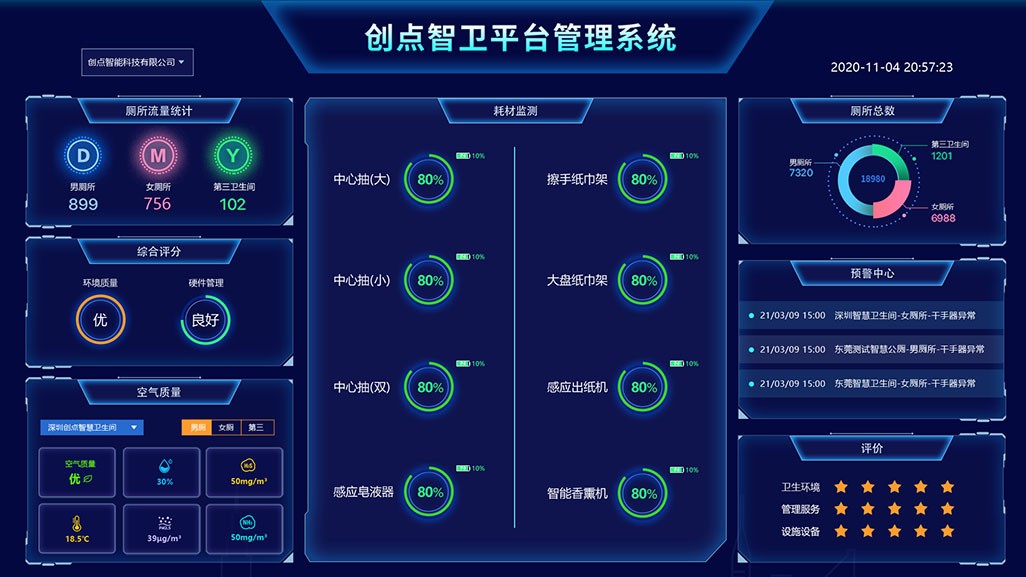 CDWK創點智慧廁所系統,通過物聯網科技實現終端→后臺的實時數據監測,將耗材使用、人流量監測、環境監測、香薰系統、蹲位監測、煙霧監測等功能完全整合進入定制化展示界面中。