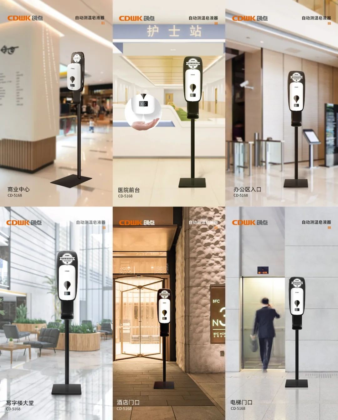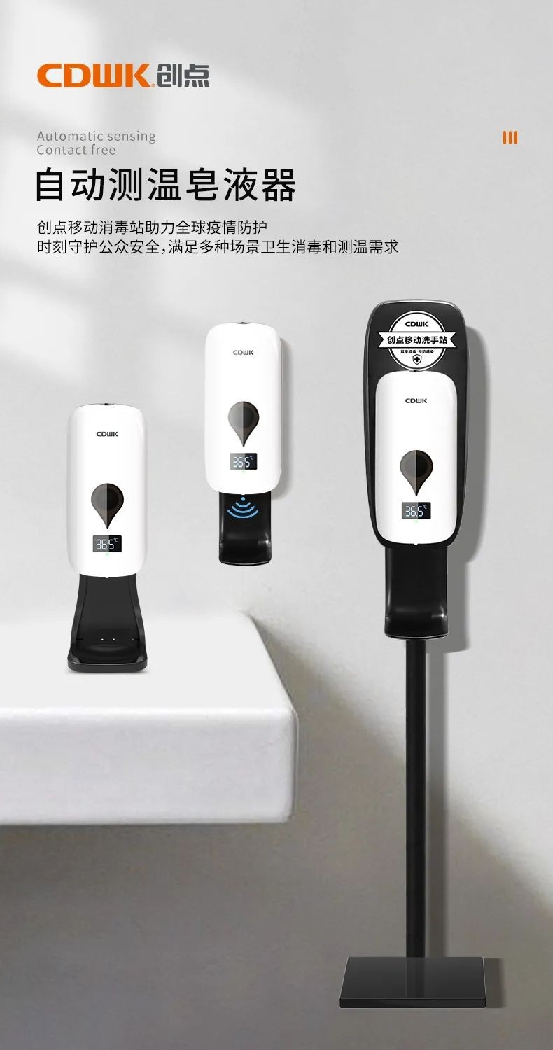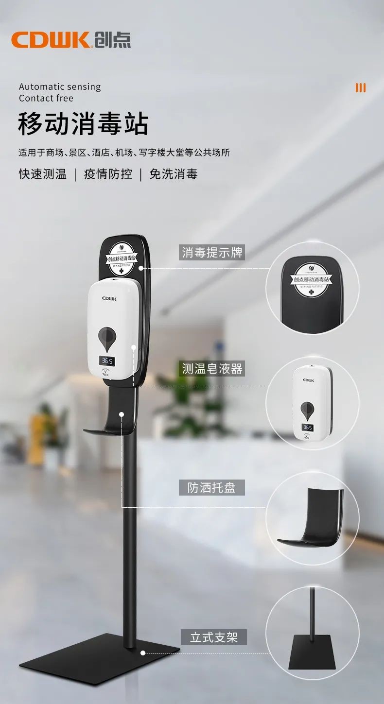 創(chuàng)點(diǎn)自動(dòng)測(cè)溫皂液器,站好公共場(chǎng)合第一道疫情防線,感應(yīng)測(cè)溫與手部消毒,12種語言自動(dòng)播報(bào)溫度與異常狀態(tài)報(bào)警,配合底座與移動(dòng)支架,滿足不同公共場(chǎng)合需求。
